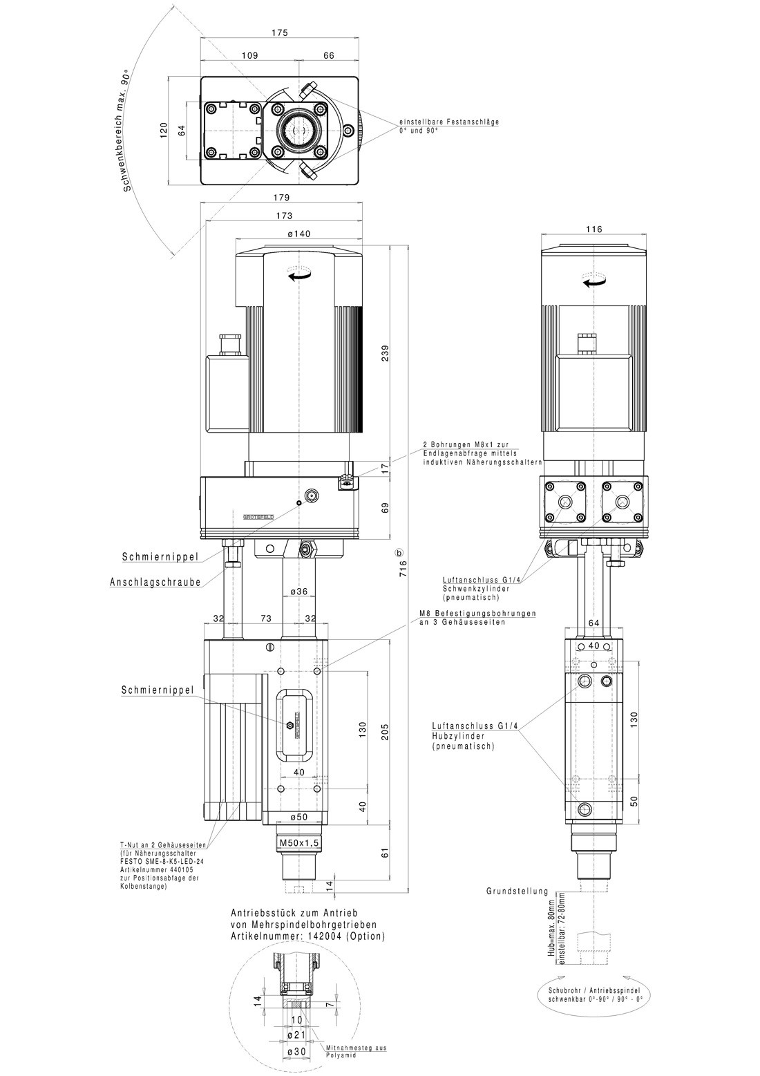 為了固定旋轉單元,外殼的 3 側各有 4 個螺紋孔 (M8)。也可以將單元固定在 50 毫米的孔中。為此需要使用鎖緊螺母 M50x1.5(可選)。